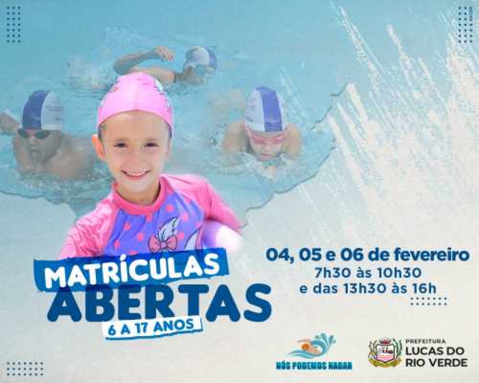A Prefeitura de Lucas do Rio Verde informa a população que novas inscrições para as aulas de natação pelo Projeto Nós Podemos Nadar, desta vez voltada para as turmas de 06 a 17 anos, serão liberadas nesta terça-feira, dia 04 de fevereiro.