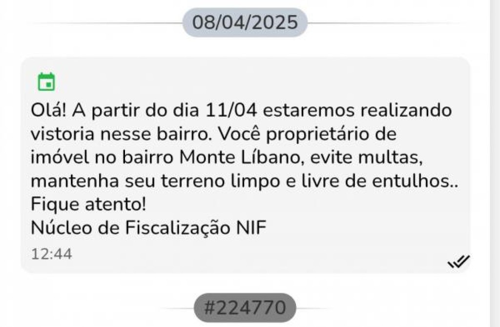Nesta semana, os fiscais do NIF estão percorrendo os bairros Monte Líbano e Rota do Sol. No entanto, a regra é clara: terreno baldio deve estar limpo sempre, com ou sem fiscalização. “Sempre que um terreno baldio for notificado, o proprietário tem 15 dias para providenciar a limpeza e apresentar defesa por escrito, com registro fotográfico que comprove que a área está livre de mato, entulho ou qualquer outro resíduo que possa oferecer risco à saúde, bem-estar e segurança pública”, detalha o coordenador do NIF, Gabriel Alves Rodrigues Neto.