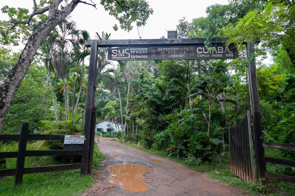 Imagem da entrada do Horto Florestal Tote Garcia, no bairro Coxipó, em Cuiabá, Mato Grosso. Uma estrutura de madeira com o nome do local dá as boas-vindas para os visitantes. O espaço abrange arborização de ambos os lados da entrada do Horto Florestal.