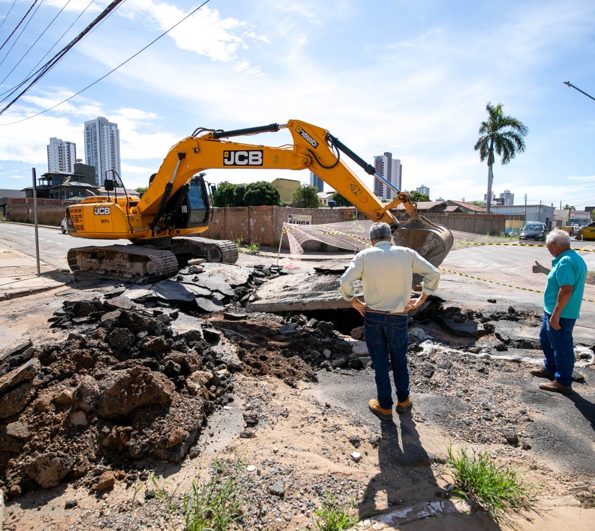 A Prefeitura de Cuiabá, por meio da Secretaria Municipal de Obras Públicas, iniciou, nesta semana, uma operação emergencial para conter os danos causados pela abertura de uma cratera no cruzamento da Rua dos Crisântemos com a Rua das Margaridas, no bairro Jardim Cuiabá.