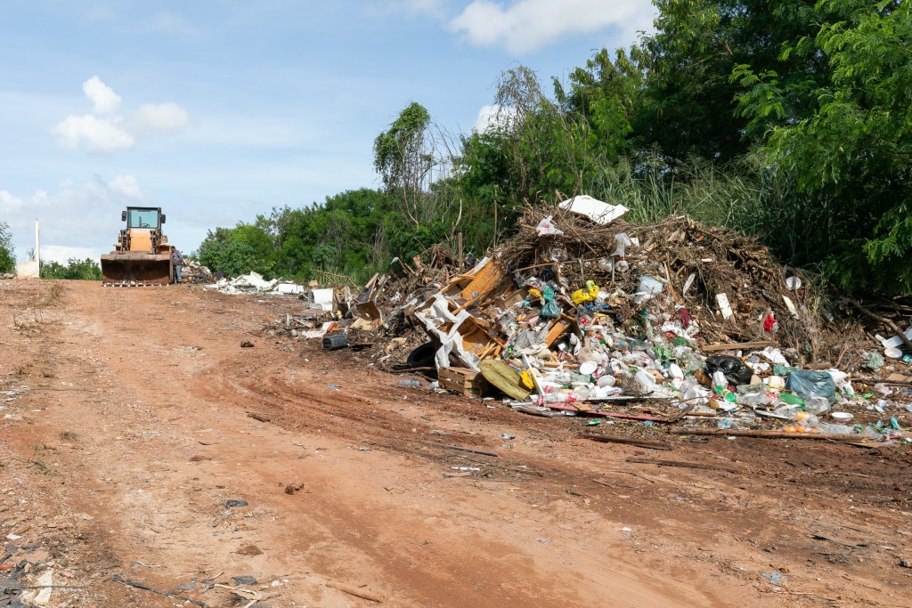 A imagem mostra um bolsão de lixo no bairro Carumbé. Ao fundo, uma pá carregadeira executa os serviços de recolhimento do material irregular.