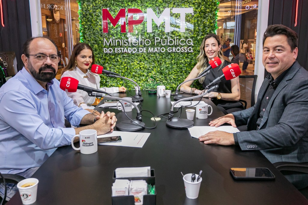 A foto mostra a secretária de Ordem Pública de Cuiabá, Juliana Chiquito Palhares, e o promotor de Justiça Mauro Poderoso de Souza no estúdio de vidro de frente à jornalista e apresentadora Marcela Vasconcelos e ao também apresentador e cientista político João Edison. Abaixo tem uma galeria de fotos que mostra outros momentos da entrevista.