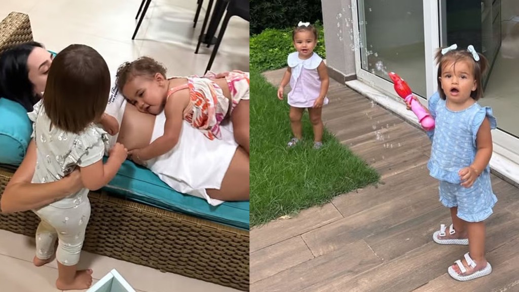 Nas imagens, Bruna mostrou as duas crianças brincando no quintal da casa, e, enquanto Mavie deitava em sua barriga, Bruna abraçava a filha da amiga. Confira.