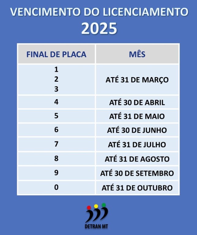 Proprietários de veículos com placas final 1, 2 e 3 devem efetuar o pagamento do Licenciamento 2025 até o dia 31 de março. A taxa pode ser emitida no site do Detran-MT (www.detran.mt.gov.br), na opção “Consulte Seu Veículo”, ou pelo aplicativo MT Cidadão.