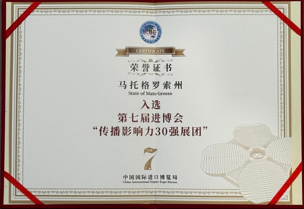 Tradução: Certificado de Honra – Mato Grosso selecionado pelo 7º CIIE – “Os 30 principais grupos de exposição com grande influência na comunicação”