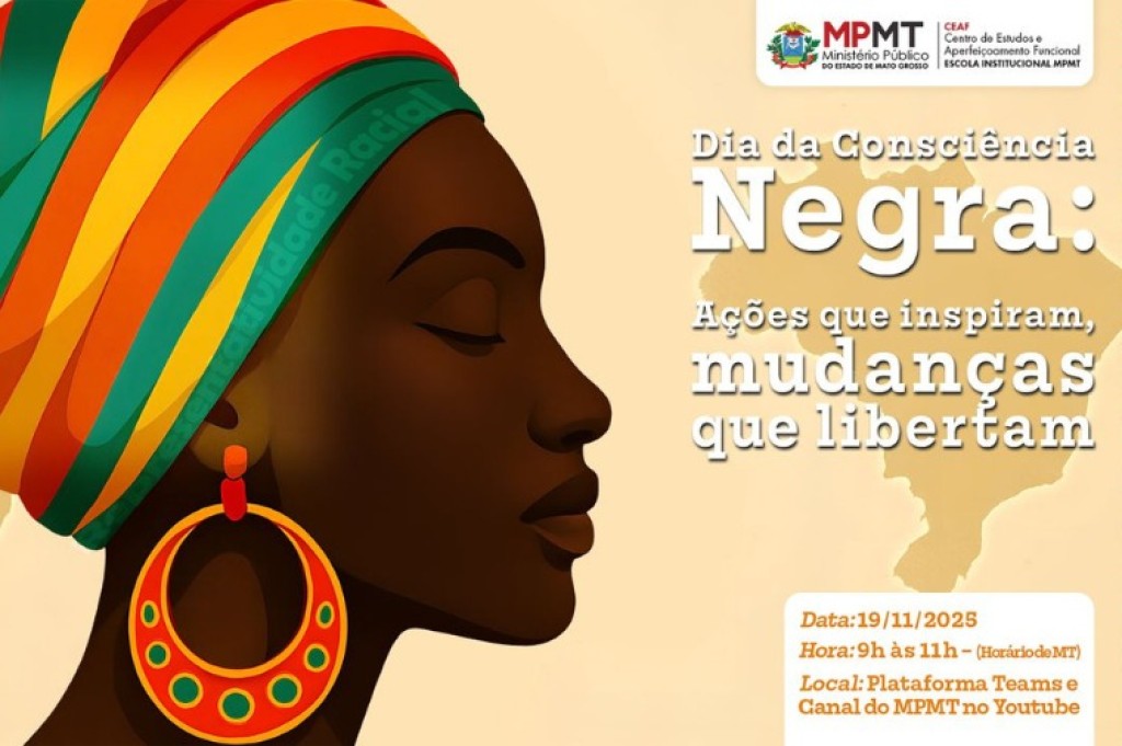 Para marcar o Dia da Consciência Negra, o Ministério Público de Mato Grosso (MPMT) realizará, nesta quarta-feira (19), o evento online “Dia da Consciência Negra: Ações que inspiram, mudanças que libertam”, com o objetivo de estimular reflexões sobre igualdade racial, diversidade e combate ao racismo estrutural.O evento é promovido pela Procuradoria de Justiça Especializada na Defesa da Cidadania, Consumidor, Direitos Humanos, Minorias, Segurança Alimentar e Estado Laico, com apoio do Centro de Estudos e Aperfeiçoamento Funcional (Ceaf) – Escola Institucional do MPMT.A programação será transmitida ao vivo, das 9h às 11h (horário de Mato Grosso), pelo canal oficial do MPMT no YouTube e pela plataforma Microsoft Teams. O encontro é aberto a membros, servidores, estagiários, residentes, colaboradores, estudantes e ao público em geral.A abertura oficial será conduzida pelo procurador de Justiça titular da Especializada, José Antônio Borges Pereira. Em seguida, às 9h15, a professora Manuela Arruda dos Santos Nunes da Silva ministrará a palestra “As políticas de ações afirmativas no serviço público e a importância das comissões de heteroidentificação racial”, com debate mediado pelo promotor de Justiça Rinaldo Ribeiro de Almeida Segundo.Para encerrar, às 10h30, a professora Jacy Proença apresentará a palestra “Políticas Municipais para a Igualdade Racial: a experiência de Cuiabá nos anos 2000”, também debatida pelo promotor Rinaldo Segundo.“O Dia da Consciência Negra não é apenas uma data simbólica, mas um chamado à transformação. Precisamos reconhecer que o racismo estrutural ainda é uma realidade e que o enfrentamento exige ações concretas e contínuas”, destaca o procurador de Justiça José Antônio Borges Pereira.