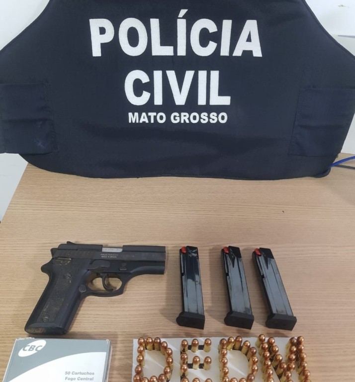 Na manhã desta quarta-feira, os policiais da Dedm Cuiabá cumpriram a ordem judicial no endereço do suspeito e apreenderam a pistola da marca Taurus e as munições.