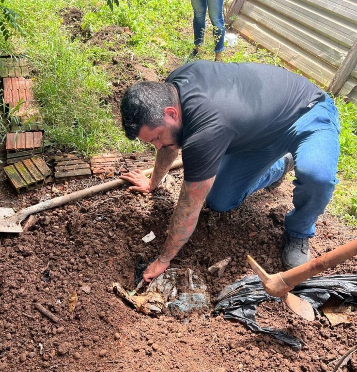 Em outro ponto do terreno, foi encontrado outro tambor enterrado, onde estavam armazenados 14 tabletes de pasta base de cocaína. Ainda no interior da residência, foram encontradas quatro porções de cloridrato de cocaína, uma balança de precisão e várias embalagens, tipo zip lock, que estavam no armário do investigado.