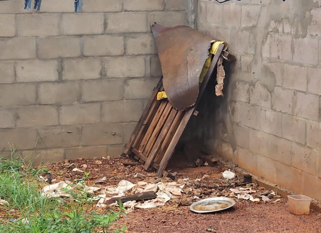 No local, o cachorro foi encontrado amarrado com uma corda curta nos fundos da casa, embaixo de um pequeno palet de madeira, que não cobria o animal das chuvas. O pequeno tamanho da corrente não proporcionava espaço para que o animal pudesse fazer suas necessidades, estando rodeado das suas próprias fezes. Ainda, devido as fortes chuvas, o animal estava molhado e tremendo frio, sem água e sem ração.