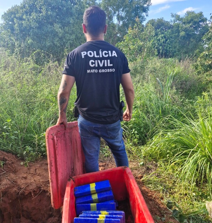 Os entorpecentes estavam enterrados em uma chácara na região do bairro Pedra 90. Com auxílio do canil da Polícia Federal, que colaborou com a operação, policiais da Delegacia de Homicídios de Rondonópolis localizaram os tabletes de maconha. A droga estava enterrada em uma caixa térmica, nos fundos da chácara, no meio de um capinzal.