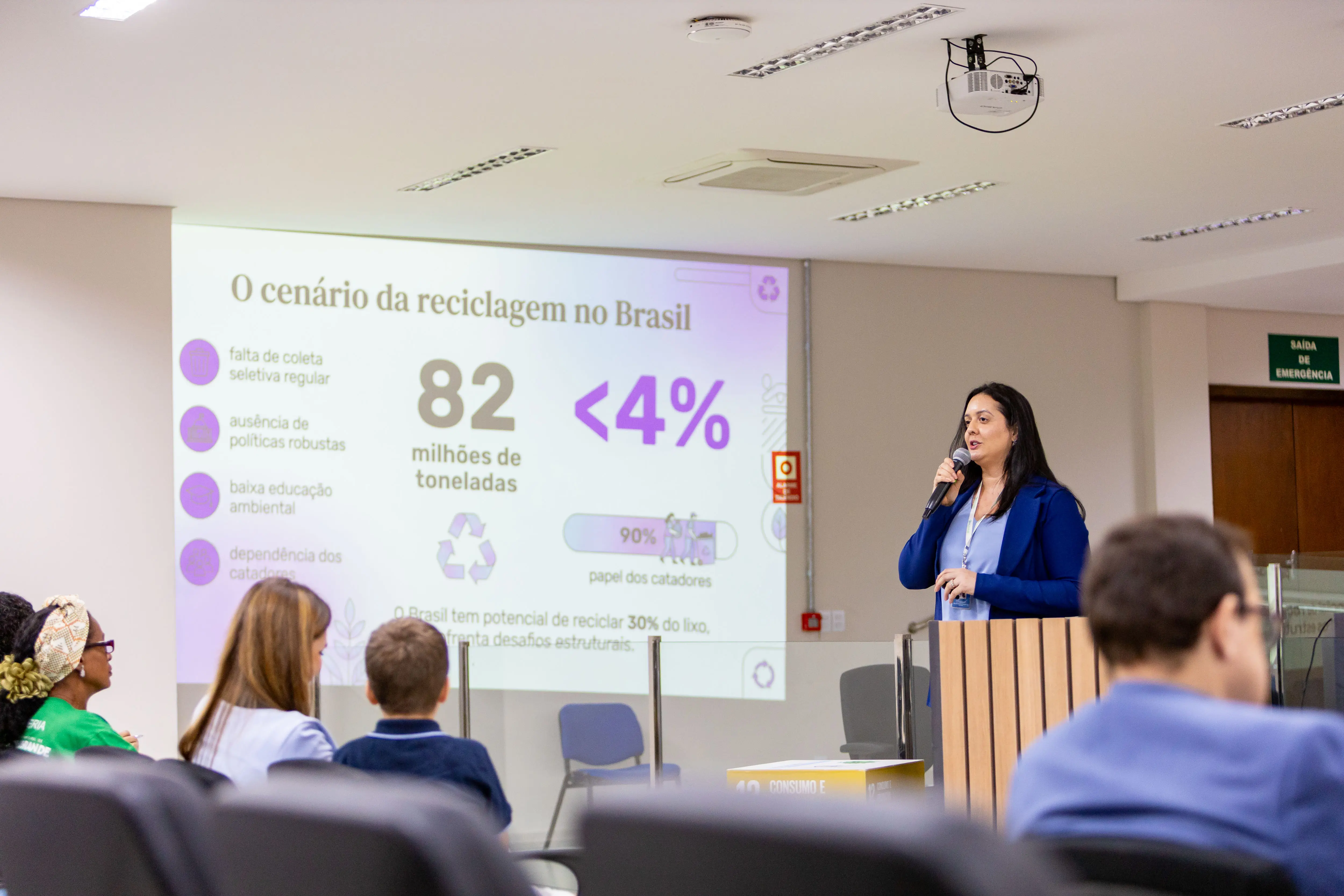 Segundo Elaine, o cenário nacional evidencia a urgência do engajamento coletivo em iniciativas que buscam a sustentabilidade ambiental. “Inicialmente, eu gostaria de falar que no Brasil nós geramos por ano 82 milhões de toneladas de resíduos. É muita coisa. E dessa quantidade, a gente consegue mandar para reciclagem menos de 4%. Então, é um quantitativo muito expressivo, uma realidade que a gente precisa mudar”, alertou.