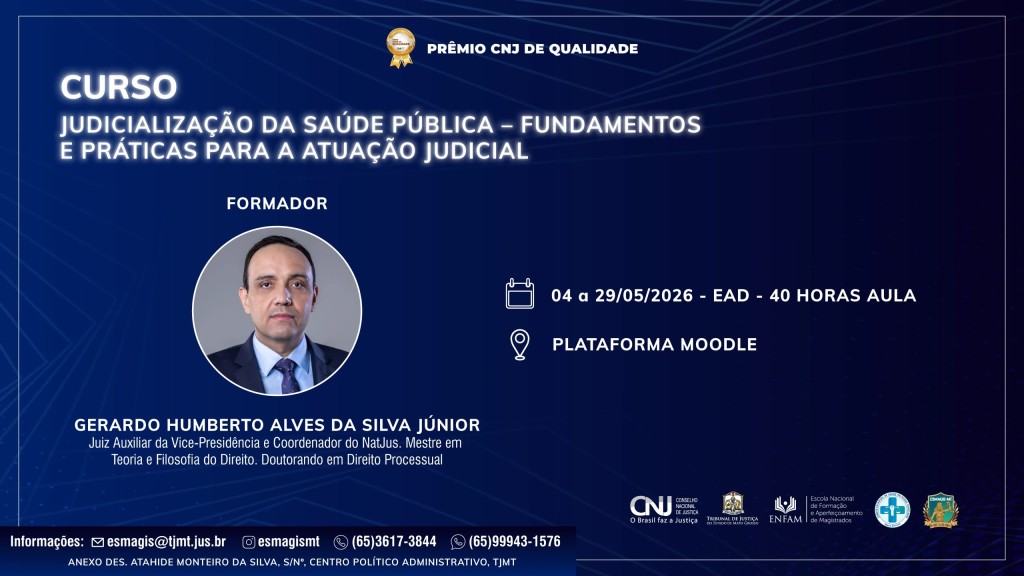 Continuam abertas as inscrições para o curso de formação continuada “Judicialização da Saúde Pública – Fundamentos e Práticas para a Atuação Judicial”, que será ofertado na modalidade Educação a Distância. Podem se inscrever magistrados(as) e assessores(as) do Poder Judiciário de Mato Grosso que atuam na Vara Especializada em Saúde Pública, bem como nas varas especializadas de Fazenda Pública, seja por jurisdição especializada ou cumulativa, com competência para resolver demandas relacionadas à saúde pública. Com carga horária total de 40 horas, o curso será ofertado entre os dias 4 e 29 de maio. Clique neste link para efetuar sua inscrição.