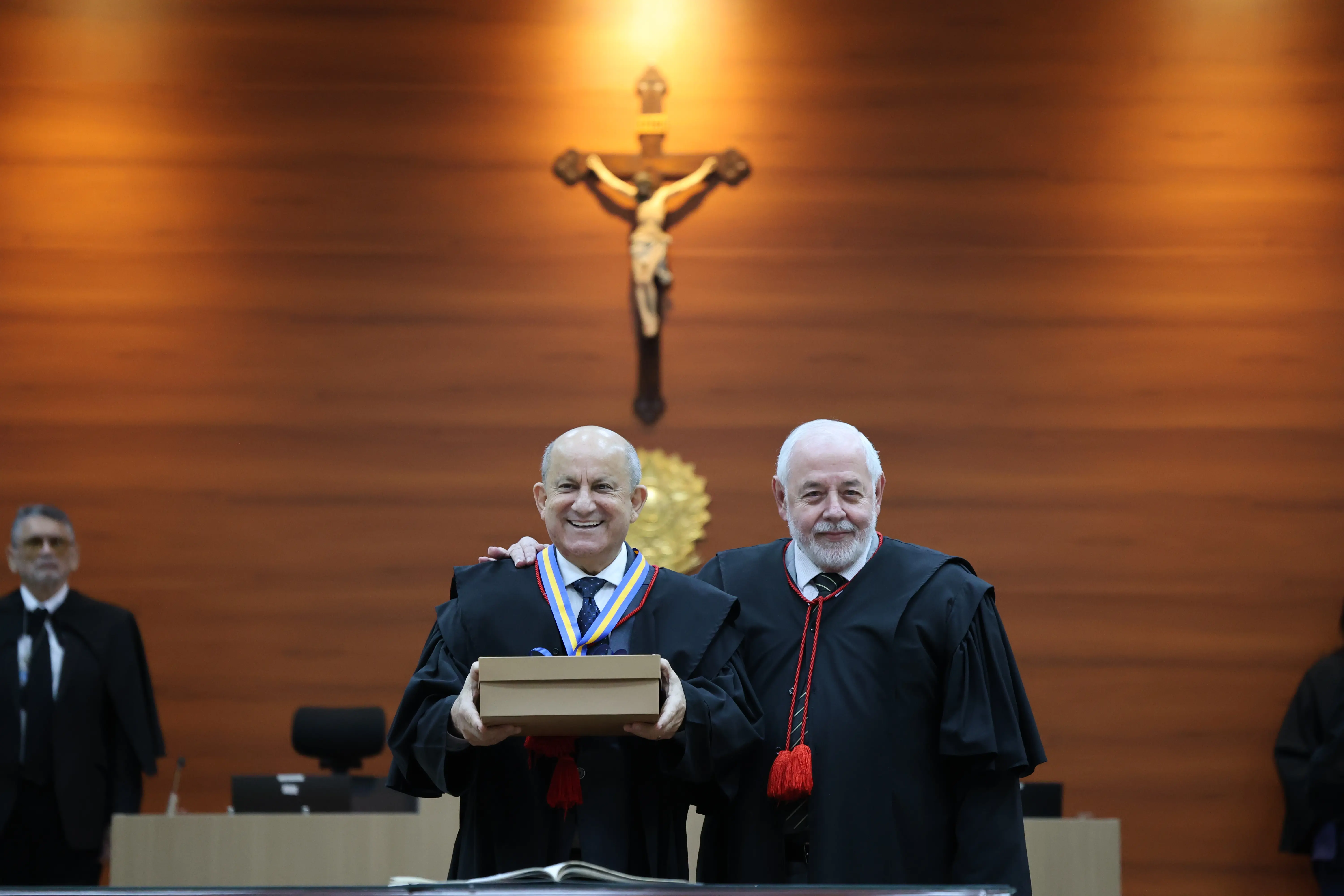 O homenageado foi conduzido pelos desembargadores Juvenal Pereira da Silva e Ricardo Gomes de Almeida ao centro do Plenário 1 para o ato formal de reconhecimento. Coube ao secretário-geral do Tribunal de Justiça, juiz Agamenon Alcântara, a leitura do termo de investidura no quadro de Medalhas do Mérito Judiciário Desembargador José de Mesquita. Na sequência, das mãos do presidente, ele recebeu a condecoração. Em seguida, o desembargador Sebastião entregou a toga e os objetos pessoais que o acompanharam ao longo da judicatura na Corte.